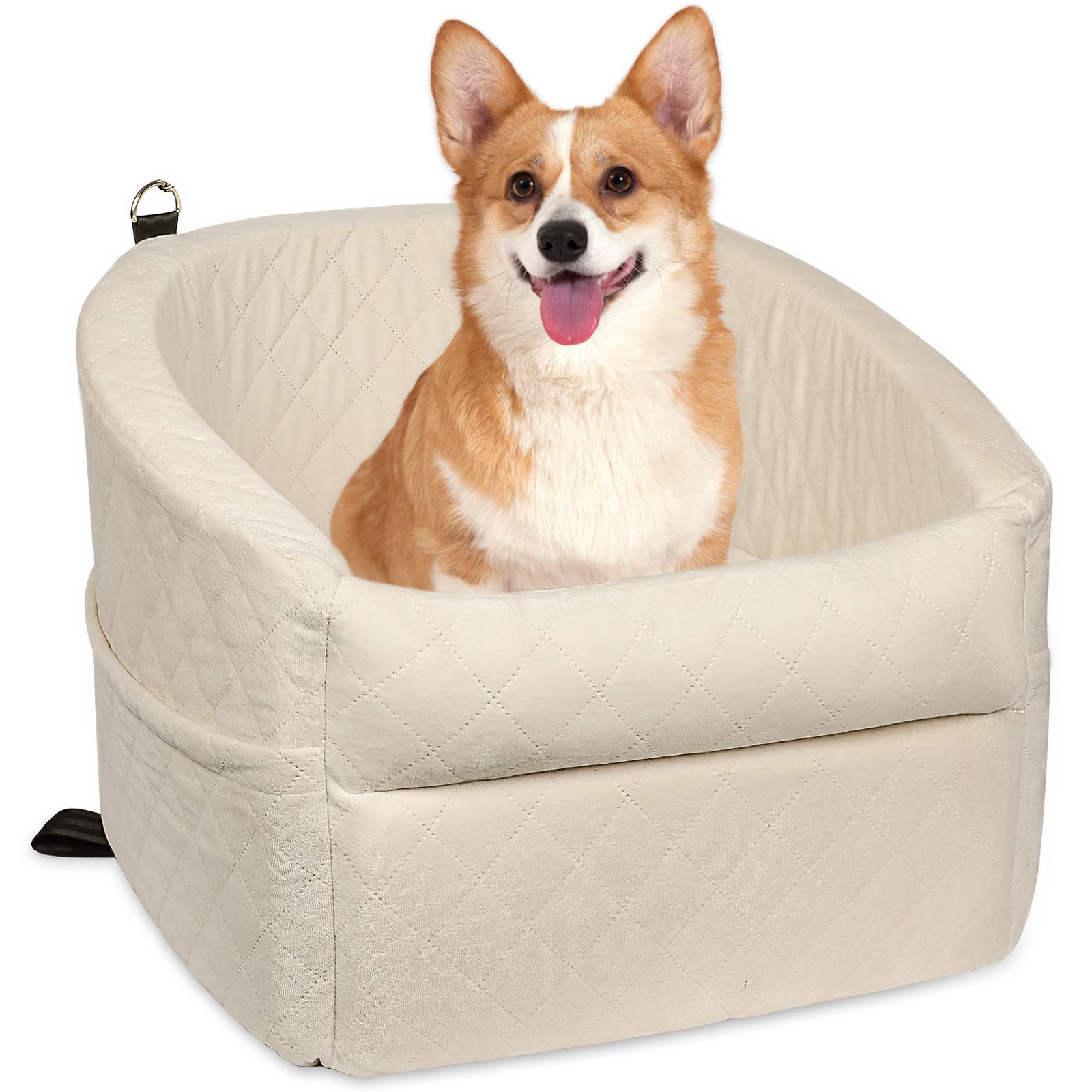 Your dog can see out the window while riding in this seat. This might help nervous dogs feel better on trips. The raised design lets them look outside without jumping up. There are pockets on the sides to hold toys or treats.