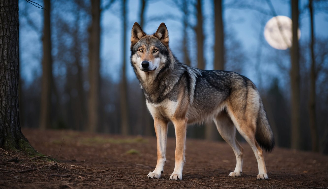 A wolf-dog stands confidently, its sleek fur and sharp features exuding strength and intelligence. A forest backdrop adds to the majestic aura